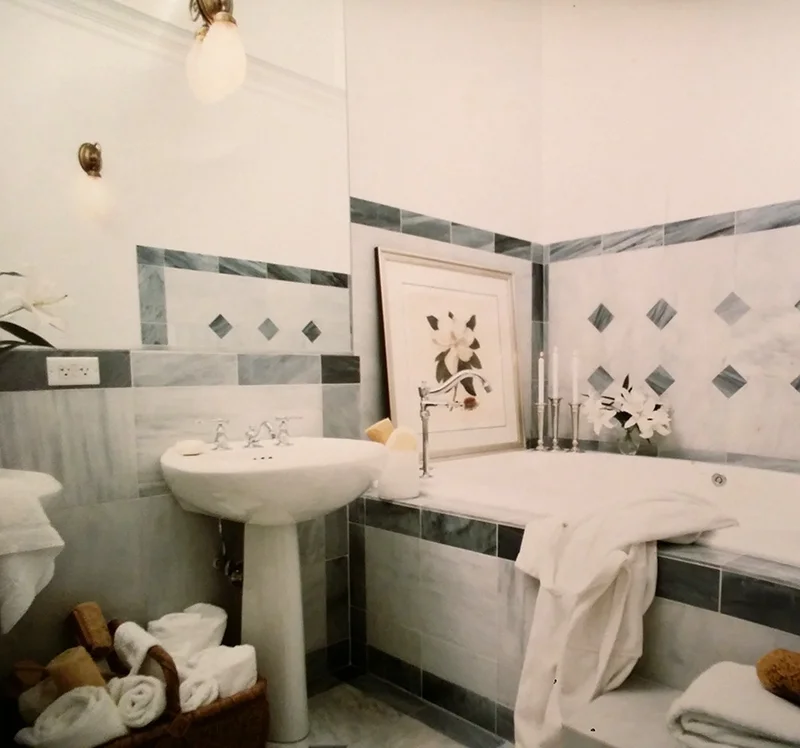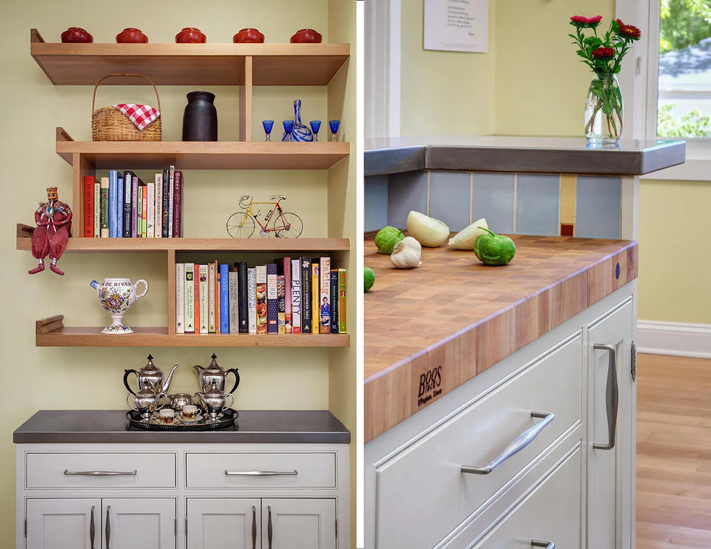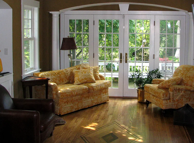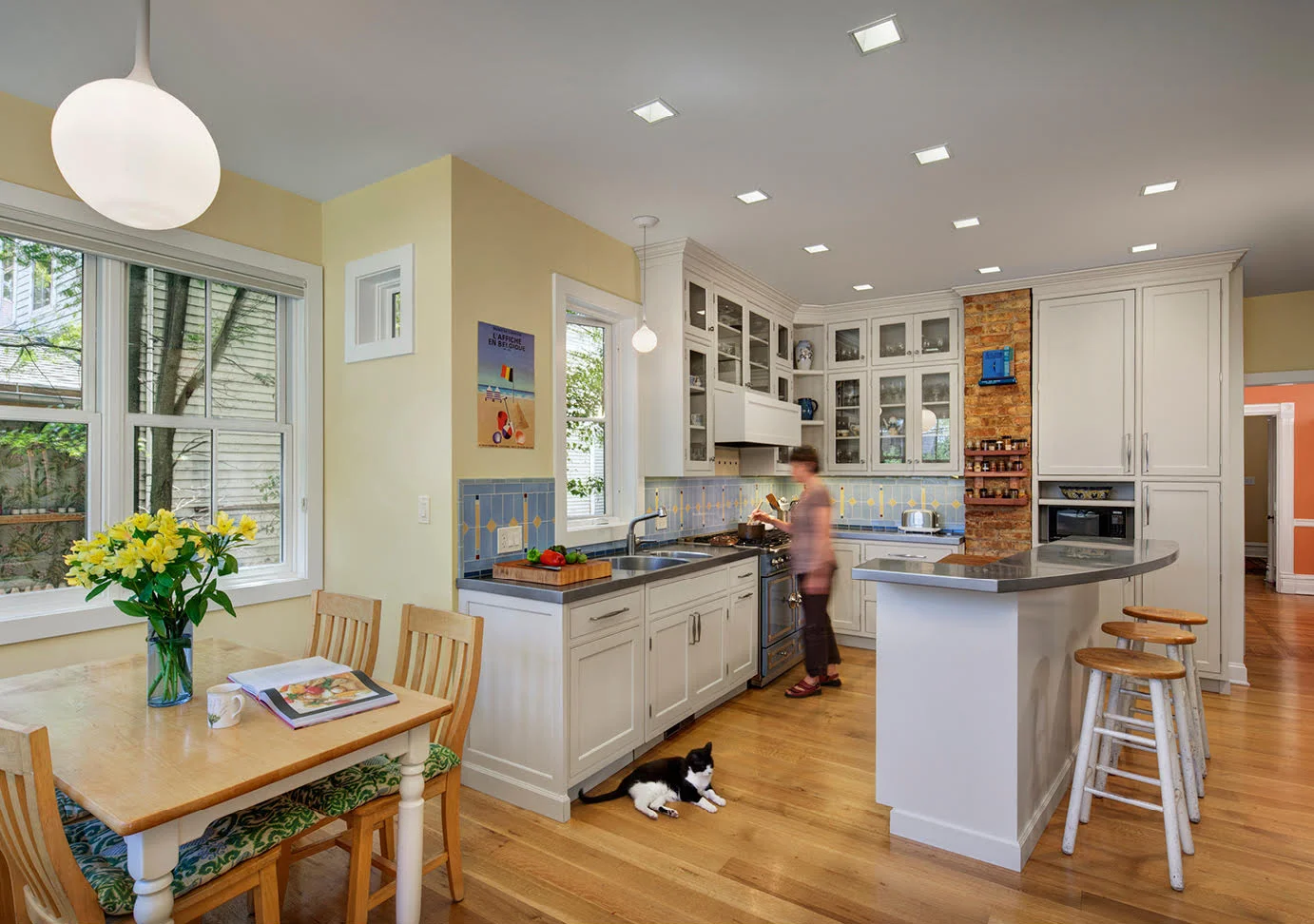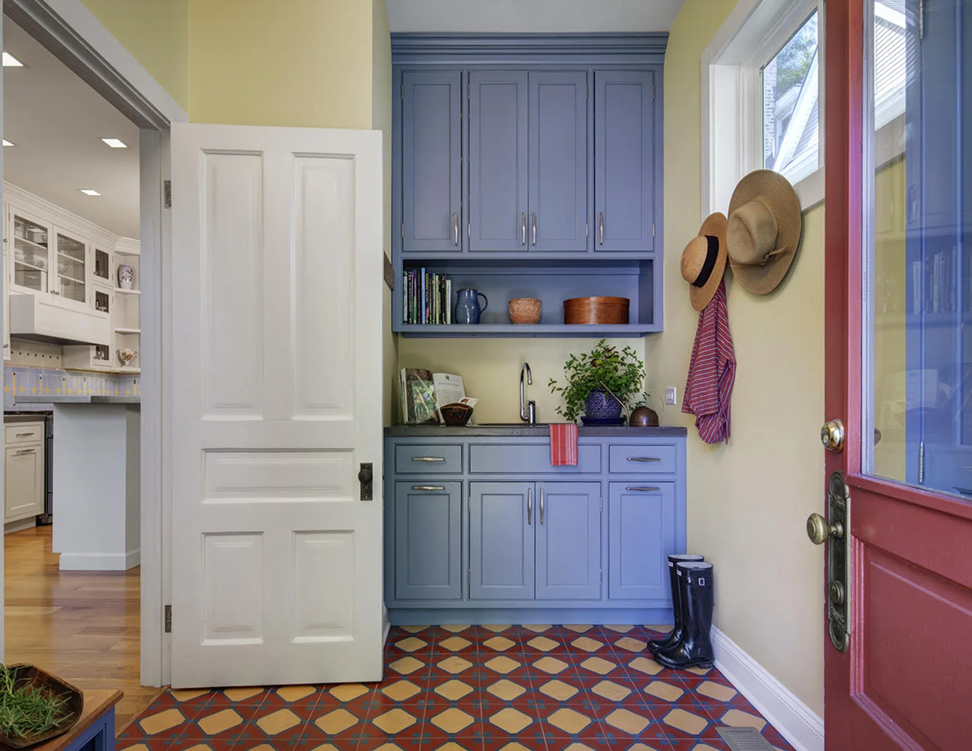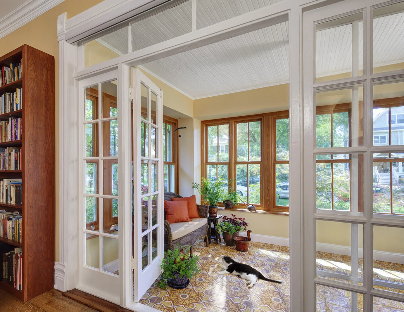 This turn-of-the-century house was brought new life by the addition of a large kitchen/potting room and master suite. Sunny tiles and the centerpiece of a La Cornefeu range make the cook’s kitchen a pleasurable work and social space. An unused front porch was revived as a three-season sunroom, with Cuban cement tiles in a lively vintage pattern. Photography by Darris Lee Harris.